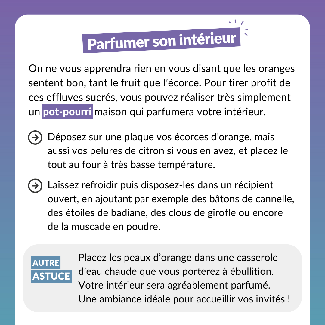 Autre astuce : placez les peaux d’orange dans une casserole d’eau chaude que vous porterez à ébullition. Votre intérieur sera agréablement parfumé. Une ambiance idéale pour accueillir vos invités !