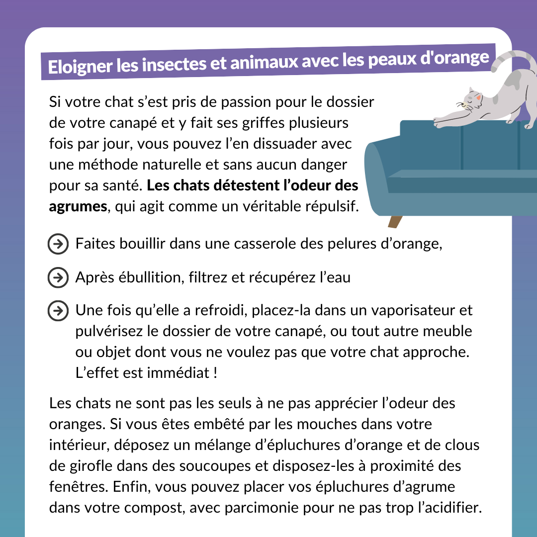 Faites bouillir dans une casserole des pelures d’orange, puis filtrez et récupérez l’eau. Une fois qu’elle a refroidi, placez-la dans un vaporisateur et pulvérisez le dossier de votre canapé, ou tout autre meuble ou objet dont vous ne voulez pas que votre chat approche. L’effet est immédiat !
