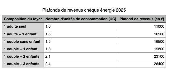 En divisant votre revenu fiscal par ce nombre d’UC, vous devez obtenir un résultat inférieur à 11 000 € pour être éligible au chèque énergie.