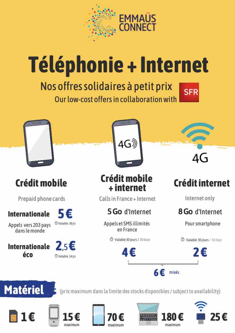En souscrivant à un forfait, vous pouvez également décider de contribuer à cette action sociale en sélectionnant l'option solidaire d’1 € qui sera reversé à Emmaüs Connect dans son intégralité. L’euro symbolique est directement prélevé de votre mensualité et la participation est sans engagement de durée.