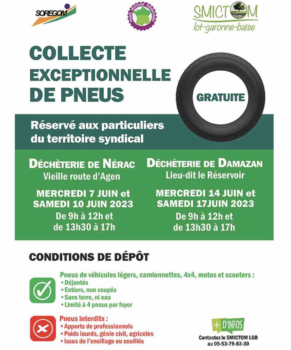 Par ailleurs, le Smictom Lot-Garonne-Baïse (LGB) gestionnaire, organise et une collecte de pneus aux horaires habituels :