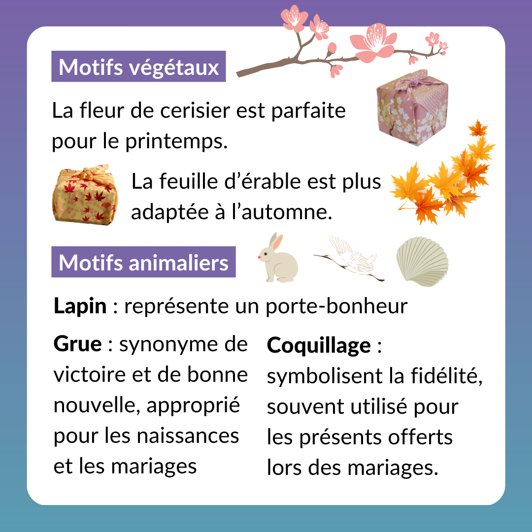 Parmi les motifs végétaux, la fleur de cerisier est parfaite pour le printemps, tandis que la feuille d’érable est plus adaptée à l’automne. Le chrysanthème symbolise la longévité et la vertu, les arabesques, associées à la couleur verte, symbolisent le bonheur et la pivoine est liée à la noblesse. Quant à la fleur de prunier, au pin ou au bambou, ils sont synonymes de bon présage.