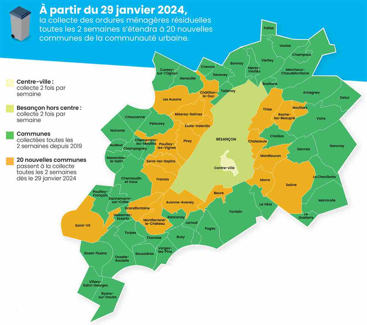 Pour ces derniers, une extension de service de collecte itinérante à vélo a été prévue par la métropole du Grand Besançon en collaboration avec le syndicat mixte SYBERT.